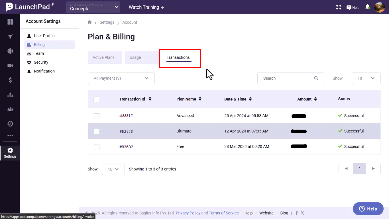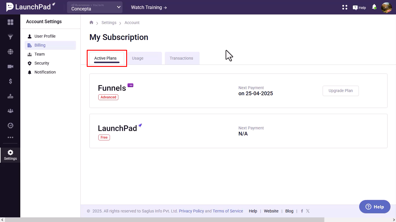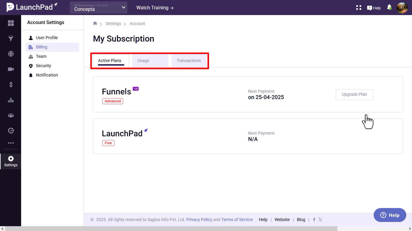- In the billing section, navigate through the three tabs: Active Plans, Usage, and Transactions.