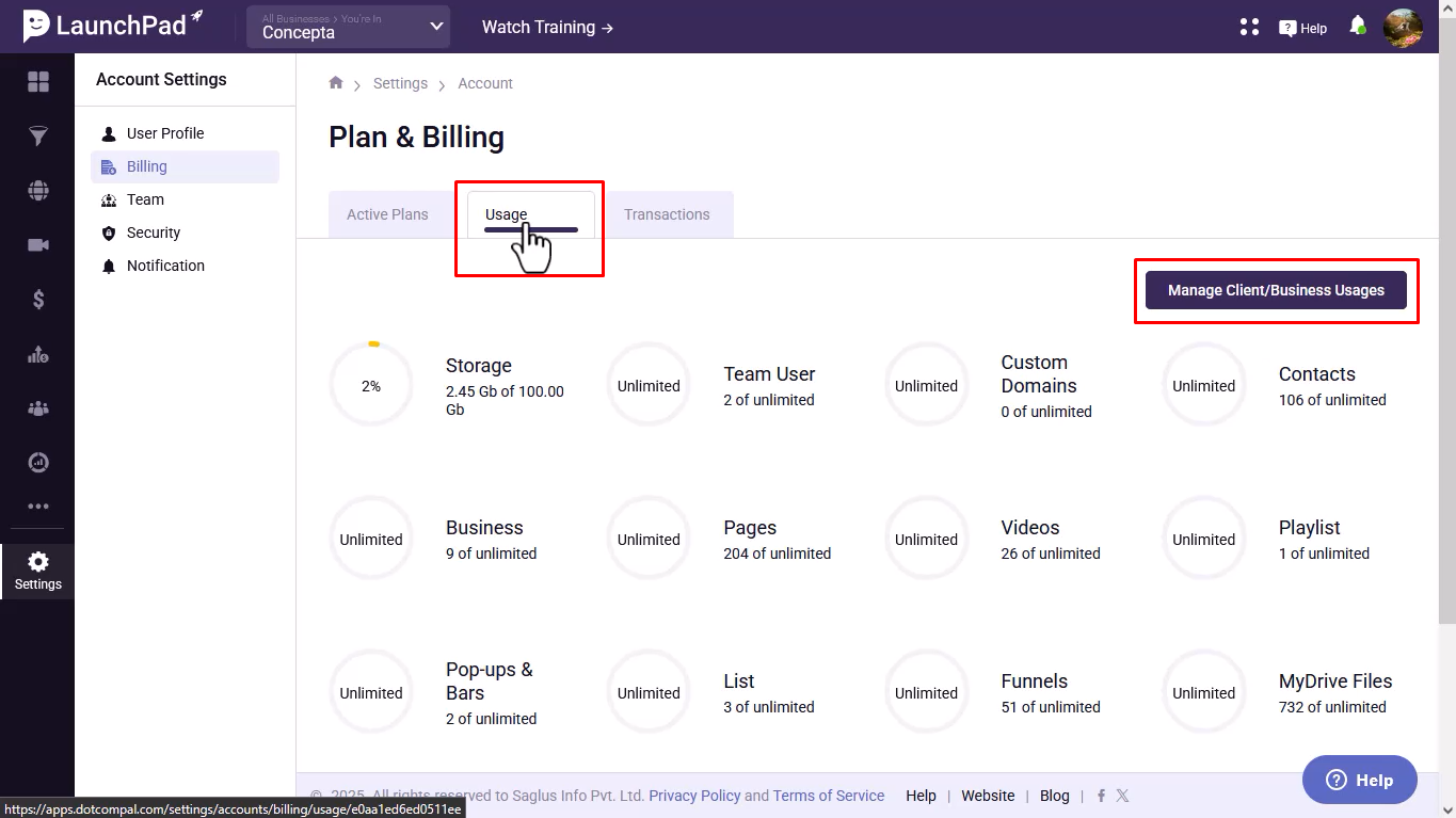 - Usage contains the account usage consumed across all created businesses. You can also manage usage on a per-business basis, a feature especially useful for agencies.