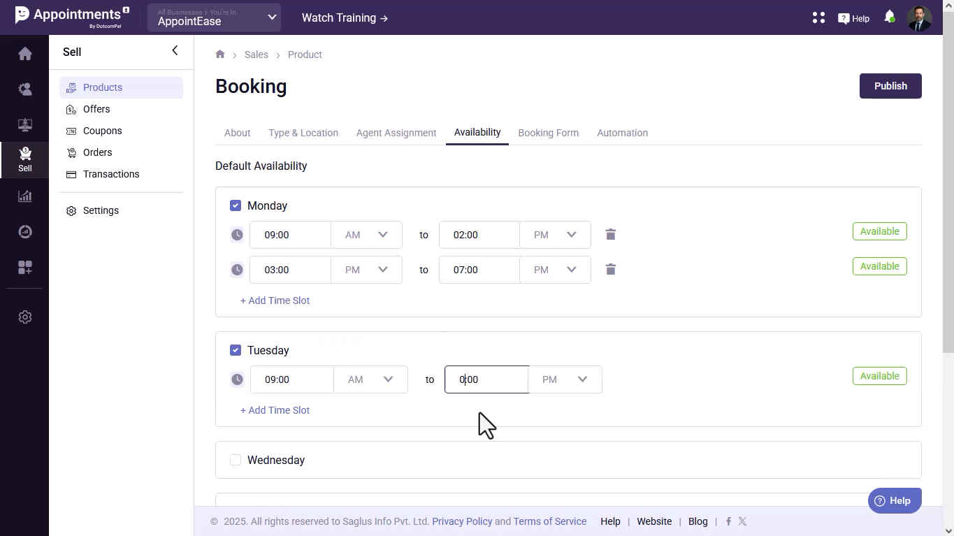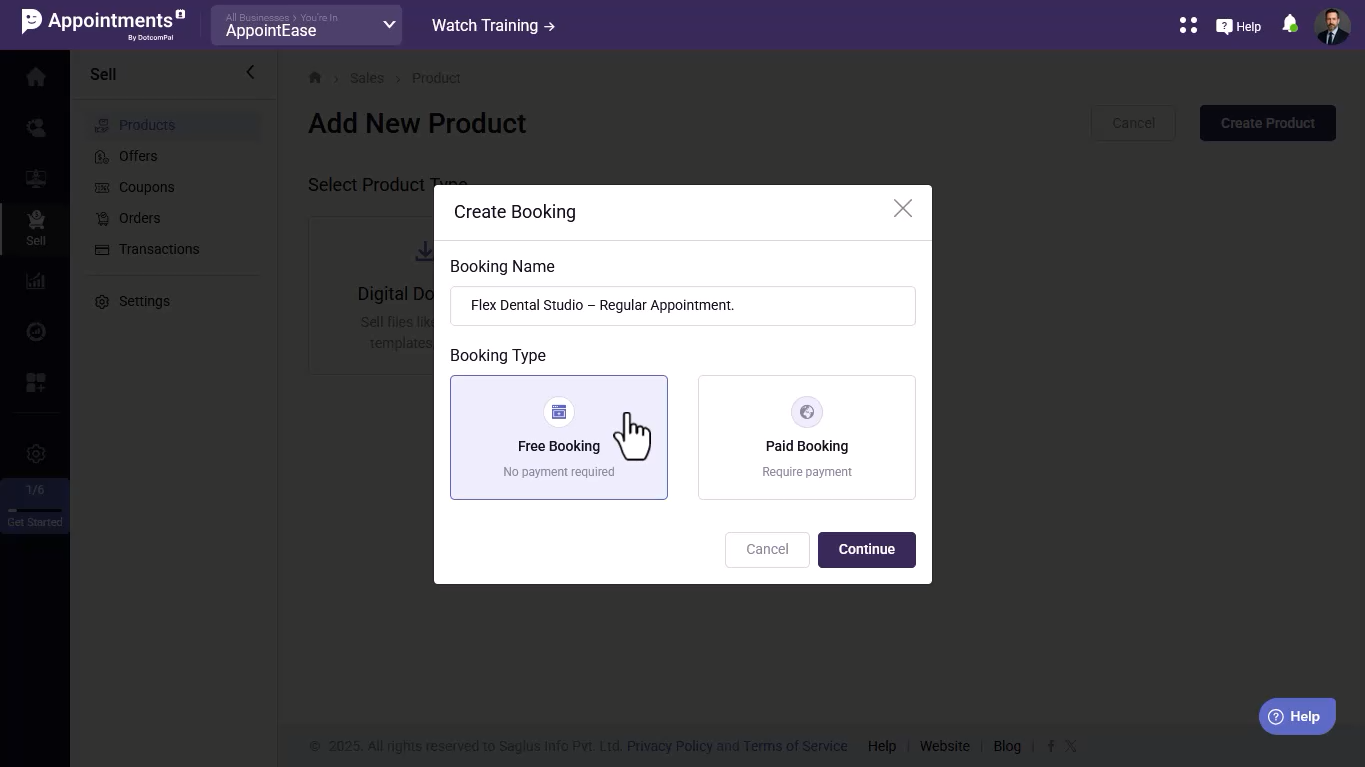 - Create a new booking by going to Sell → Add Product → Bookings, name it, choose the booking type, and continue.