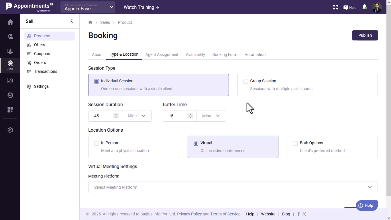 - Select the session type, set meeting duration and buffer time, choose the meeting location, and connect your meeting platform.