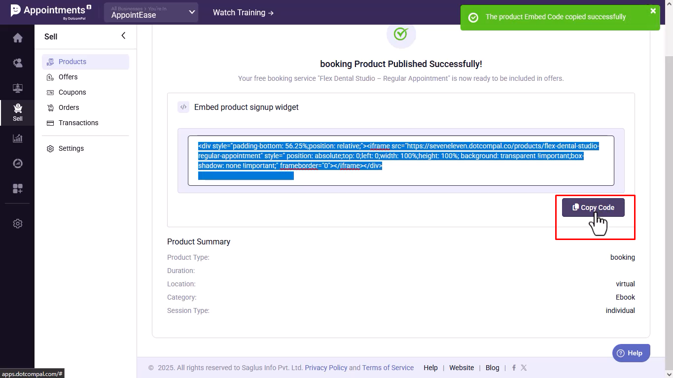 - Copy the booking embed code if you want to place it on a website or page.