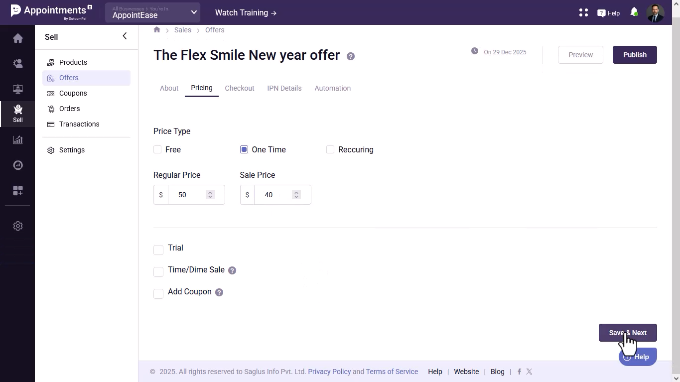 - For paid bookings, create an offer, add pricing, and connect your payment gateway.