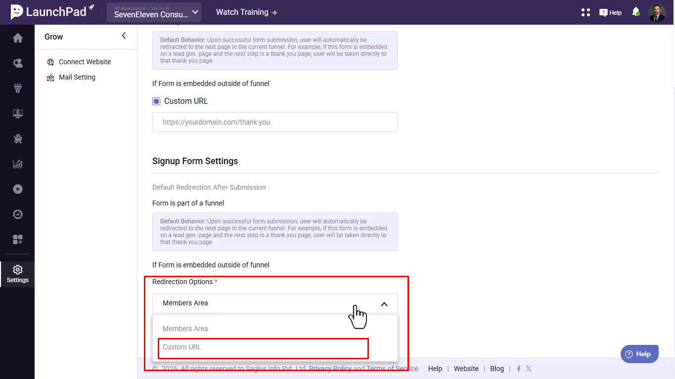 - If the form is used outside a funnel, you can set a custom redirect URL.